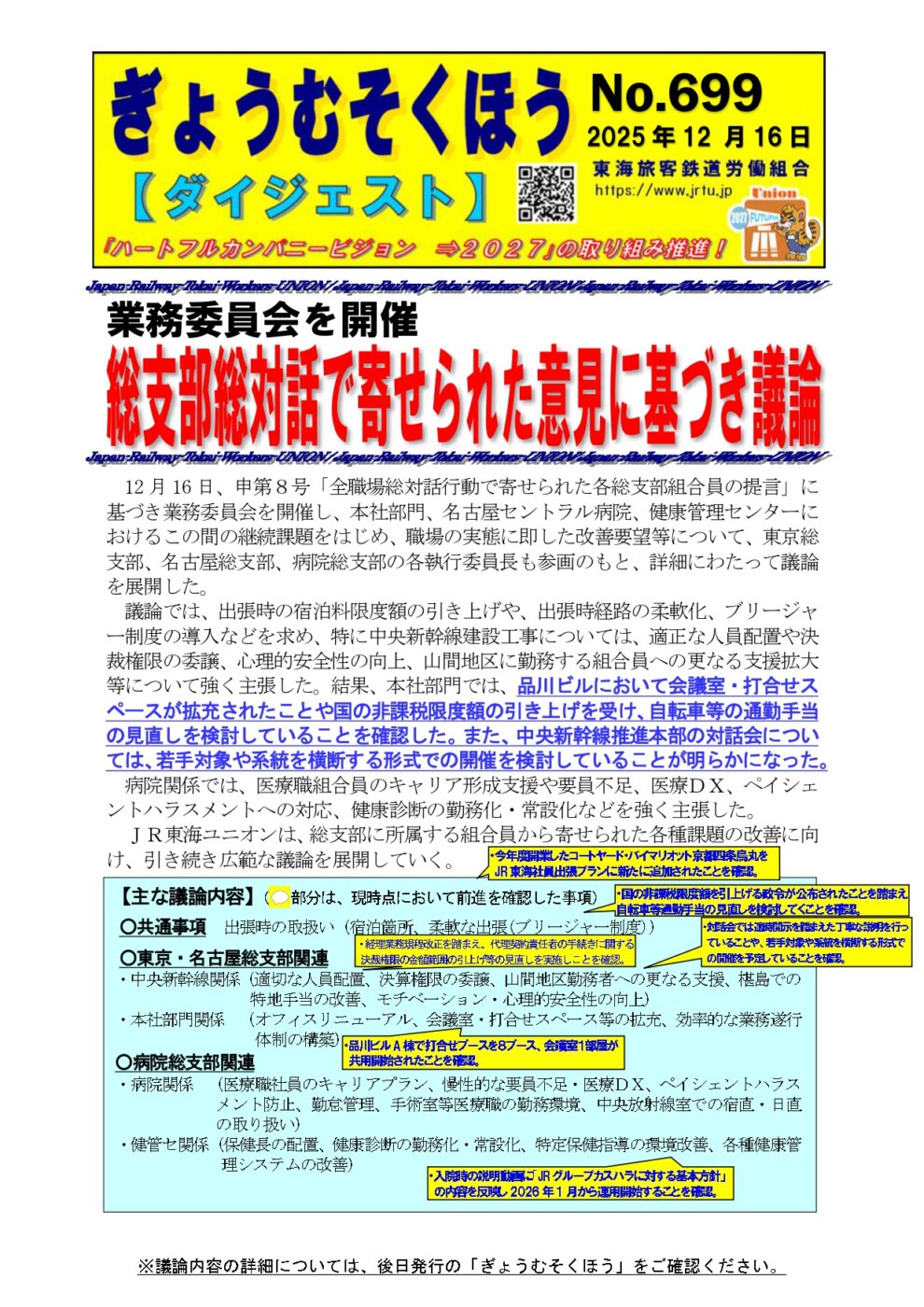 12 月16日、申第8号「全職場総対話行動で寄せられた各総支部組合員の提言」に基づき業務委員会を開催し、本社部門、名古屋セントラル病院、健康管理センターにおけるこの間の継続課題をはじめ、職場の実態に即した改善要望等について、東京総支部、名古屋総支部、病院総支部の各執行委員長も参画のもと、詳細にわたって議論を展開しました。